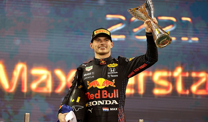 ABU DHABI, UNITED ARAB EMIRATES – DECEMBER 12: Race winner and 2021 F1 World Drivers Champion Max Verstappen of Netherlands and Red Bull Racing celebrates on the podium during the F1 Grand Prix of Abu Dhabi at Yas Marina Circuit on December 12, 2021 in Abu Dhabi, United Arab Emirates. (Photo by Lars Baron/Getty Images)