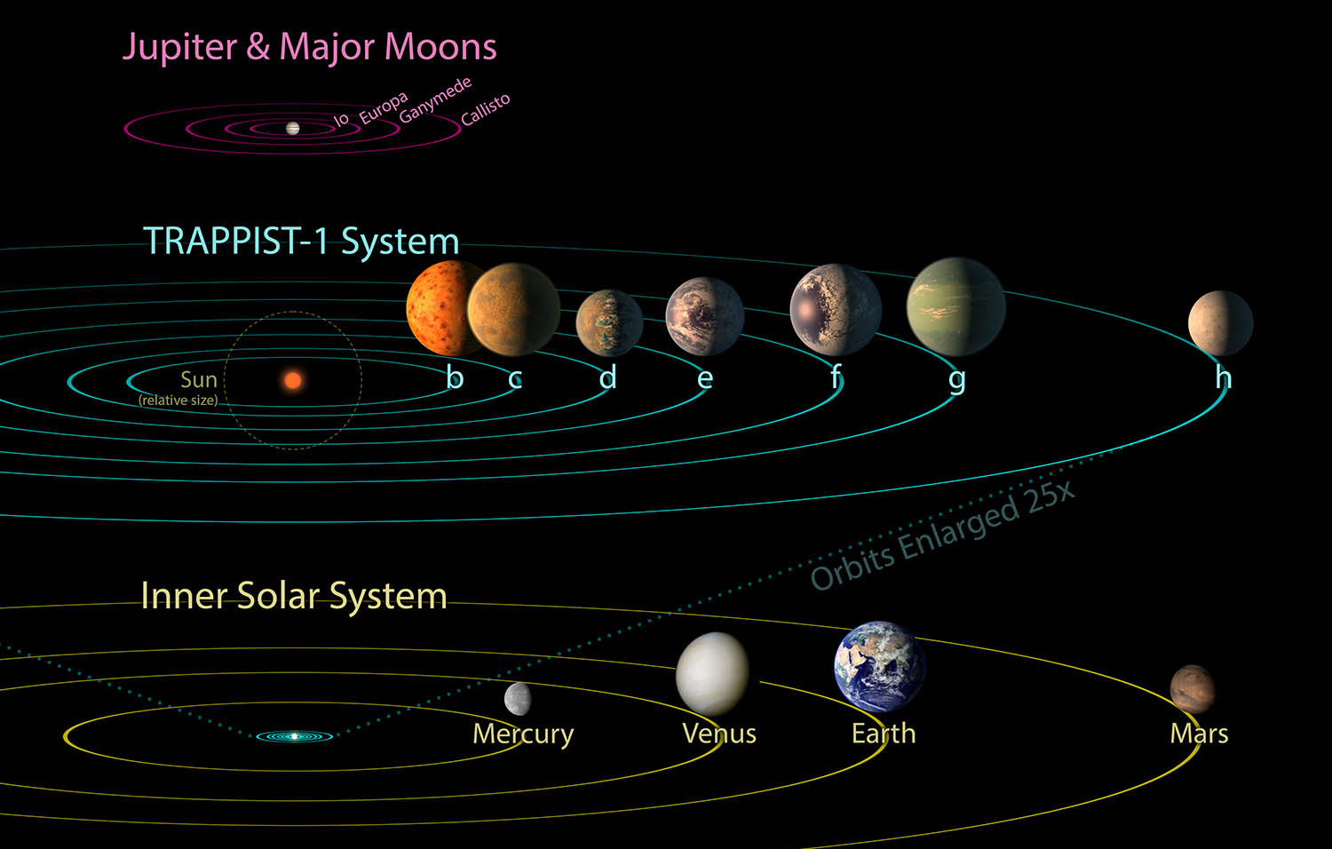 All seven planets discovered in orbit around the red dwarf star TRAPPIST-1 could easily fit inside the orbit of Mercury, the innermost planet of our solar system. In fact, they would have room to spare. TRAPPIST-1 also is only a fraction of the size of ou